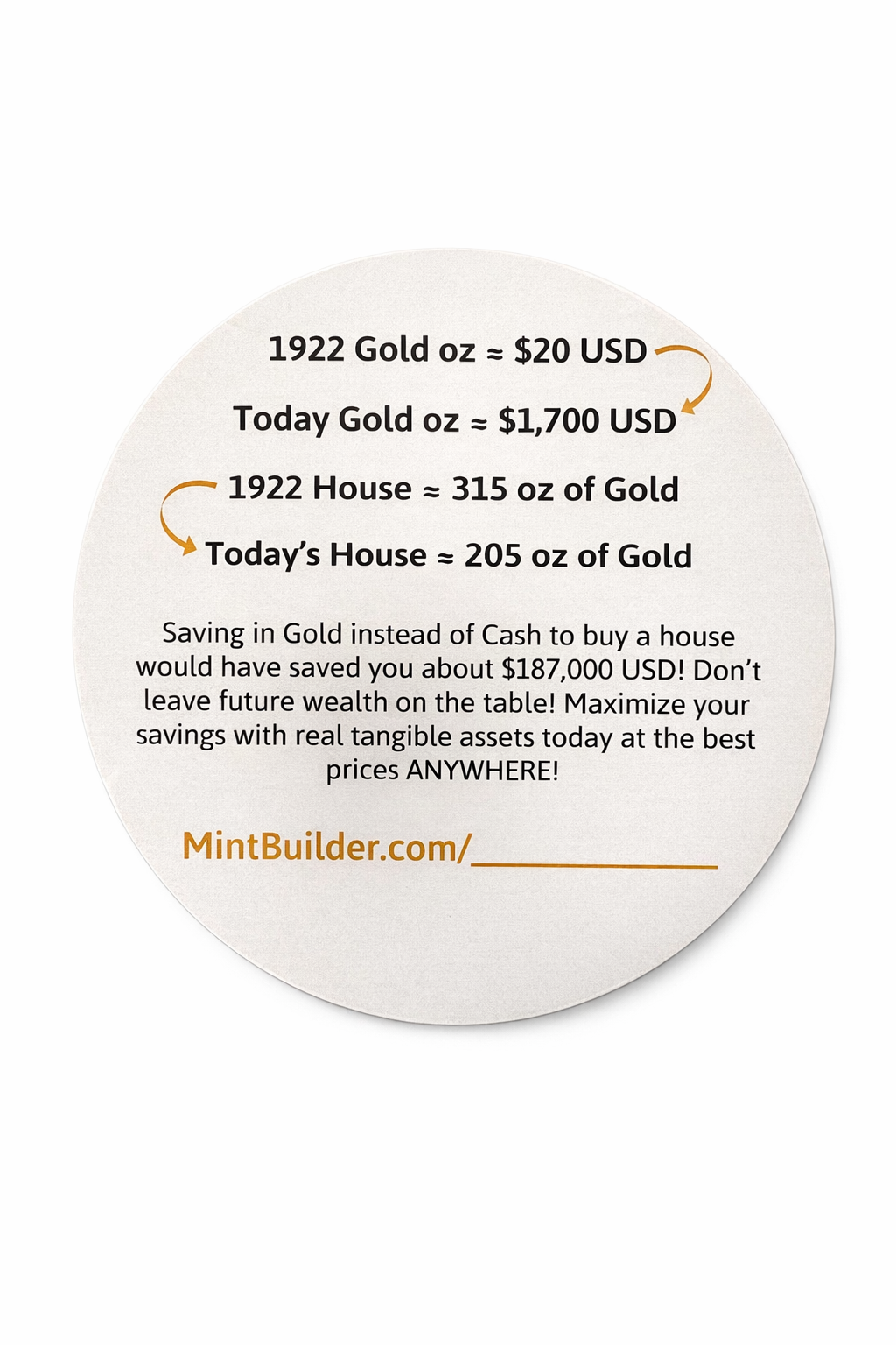 Because the card looks like a giant gold coin, it naturally grabs attention and encourages people to read the message and visit your MintBuilder page.
