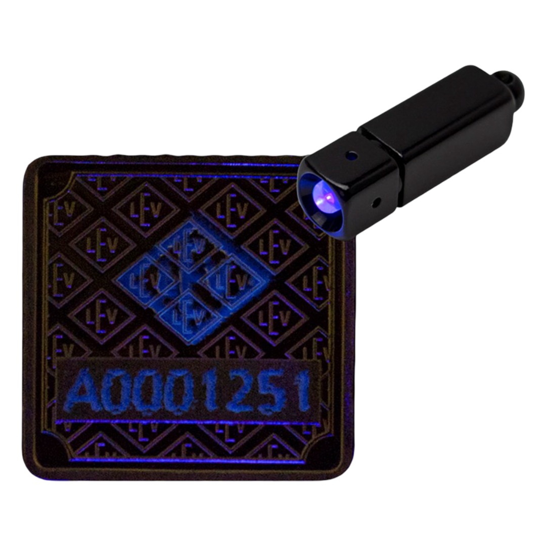 | Reverse: | LEV logo pattern; stamped serial number; UV-revealed LEV rhombus |