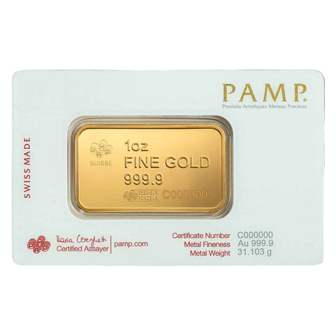 - β Obverse: PAMP Suisse logo, weight, purity, serial number, and Essayeur Fondeur stamp