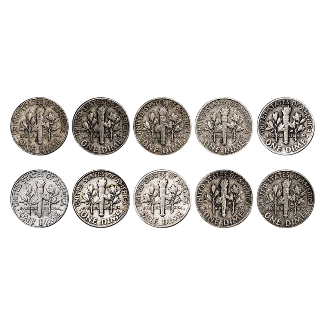 All dimes are 1964 or earlier and struck by the United States Mint in 90% Silver. These are typically a mix of Roosevelt and Mercury dimes in Average Circulated condition, valued primarily for their Silver content rather than numismatic rarity.