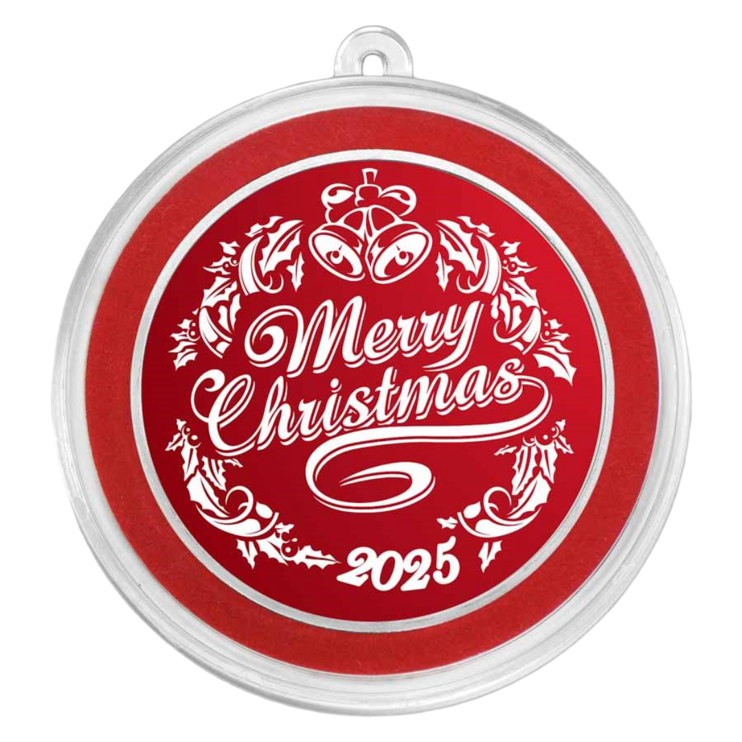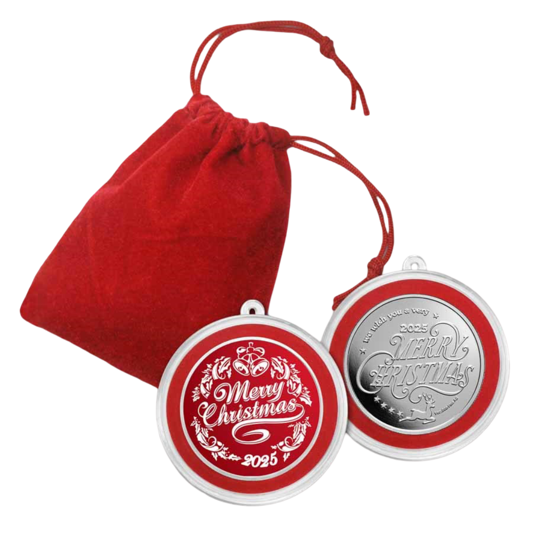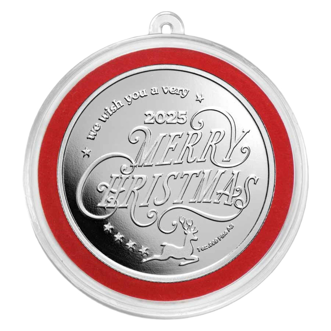Each round contains 1 oz of .999 fine silver and arrives in a protective capsule with a built-in hanging loop—ideal for displaying on a Christmas tree. A velvet pouch is included for easy gifting. The obverse showcases a vivid rosy-red “Merry Christmas” design, while the reverse features a stylized festive motif with a reindeer silhouette, the year 2025, and the round’s weight and purity.